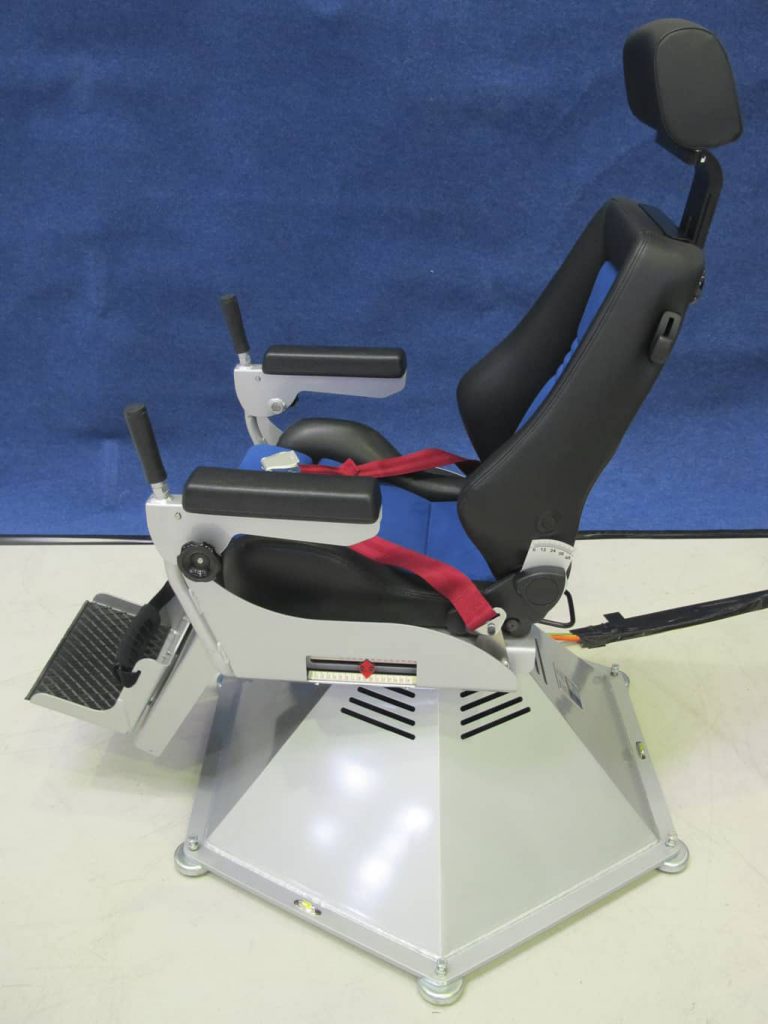 Headrest, armrests and additional leg and foot rest. This guarantees that the trainees feet will not touching the floor. Adjustable support for the back, head, feet and arms in order to provide training for different human body sizes. 2-point lap seat belt, which ensures the safety of the trainee and which gives the trainee the possibility to bend over head and body towards the knees.
